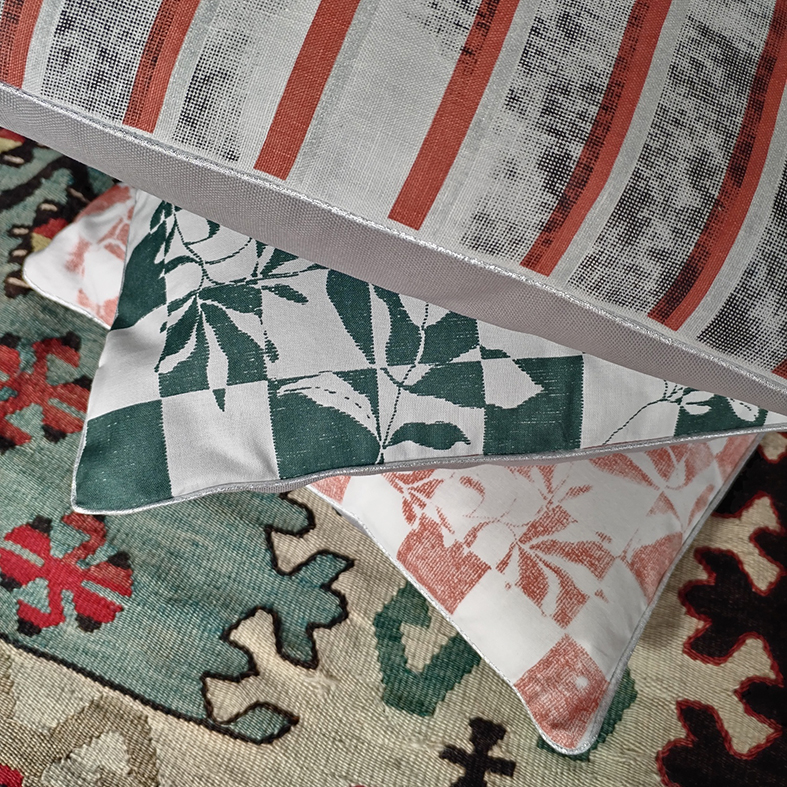 J’ai ensuite utilisé mes tissus imprimés pour confectionner des coussins 40×40 cm, avec un passepoil argenté. Une belle manière de donner vie à mes motifs et de transformer une expérience d’atelier en objets du quotidien.