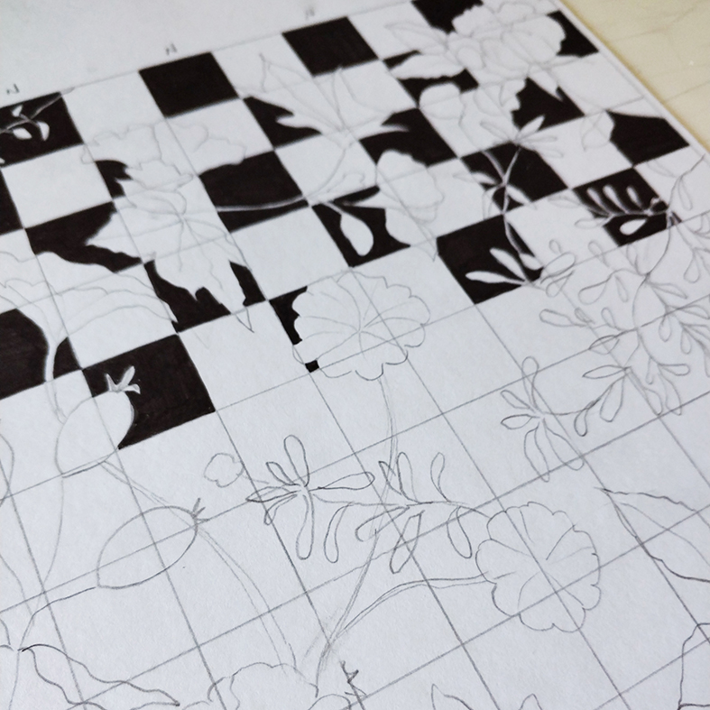 Pour le motif en une couleur, j’ai dessiné un damier de fleurs, à la main au marqueur fin puis l’ai scanné. Avant l’impression, j’ai préparé ce dessin sur Photoshop : en bitmap (noir et blanc, sortie à 150 dpi) afin d’obtenir des contours nets et exploitables pour l’insolation. J’ai également épaissi certains traits trop fins (< 1 pixel) pour garantir leur passage en impression.
