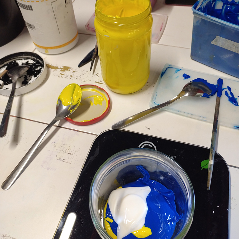 En parallèle, comme des laborantines, nous avons testé nos couleurs au gramme près pour arriver à la couleur souhaitée…