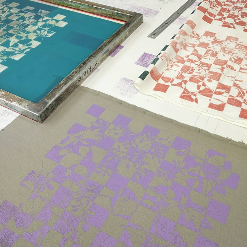 À l’aide d’une raclette, l’encre est déposée à travers la maille, un geste simple en apparence mais qui demande précision et régularité. Après séchage et fixation des couleurs à chaud, les motifs se révèlent dans toute leur intensité.