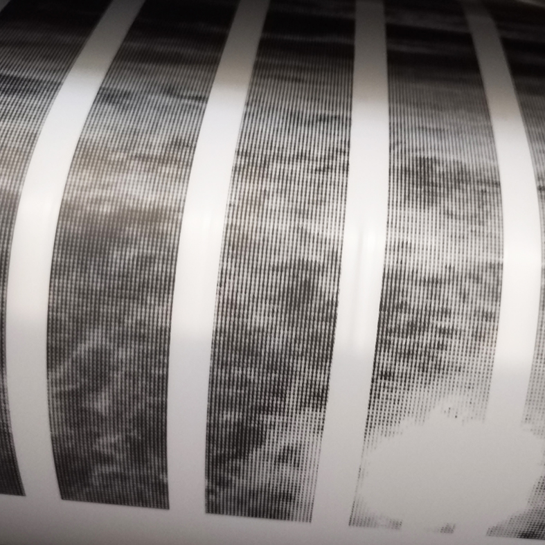 Pour le motif en trois couleurs, j’ai choisi une photo prise au bord de l’océean. Transformée en niveaux de gris sur Photoshop, je l’ai ensuite convertie en trames de demi-teintes. Il faut préparer un calque par couleur rajouter des croix de repère pour pouvoir ensuite bien aligner les typons. Pour ce projet, j’en ai donc créé trois, un pour l’encre rose transparente, un pour l’encre argentée opaque, et un pour la trame en noir. La linéature, qui correspond au nombre de points par pouce, a été définie en fonction de la maille utilisée : pour une maille de 77, j’ai travaillé la trame avec une linéature de 25.