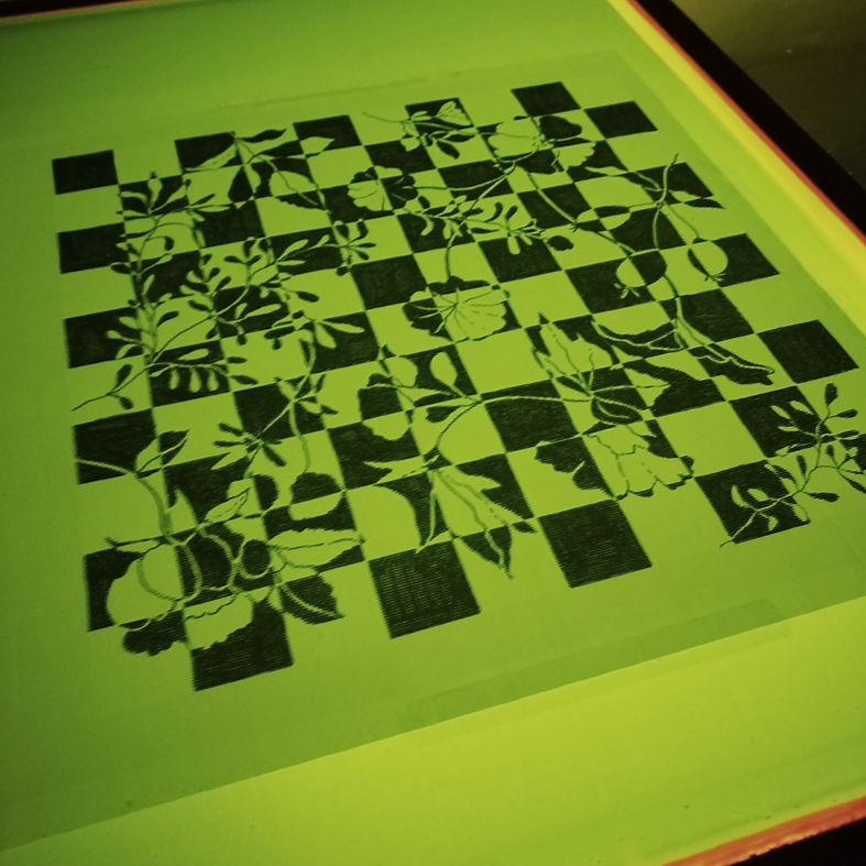 La maille du cadre joue en effet un rôle clé : plus elle est serrée, moins l’encre passe. J’ai utilisé une maille de 54 fils pour le premier motif (idéale pour les aplats), et une maille de 77 pour le second, qui demandait plus de finesse par sa trame. Le prochain sur soie demandera lui une maille de 90, à suivre…